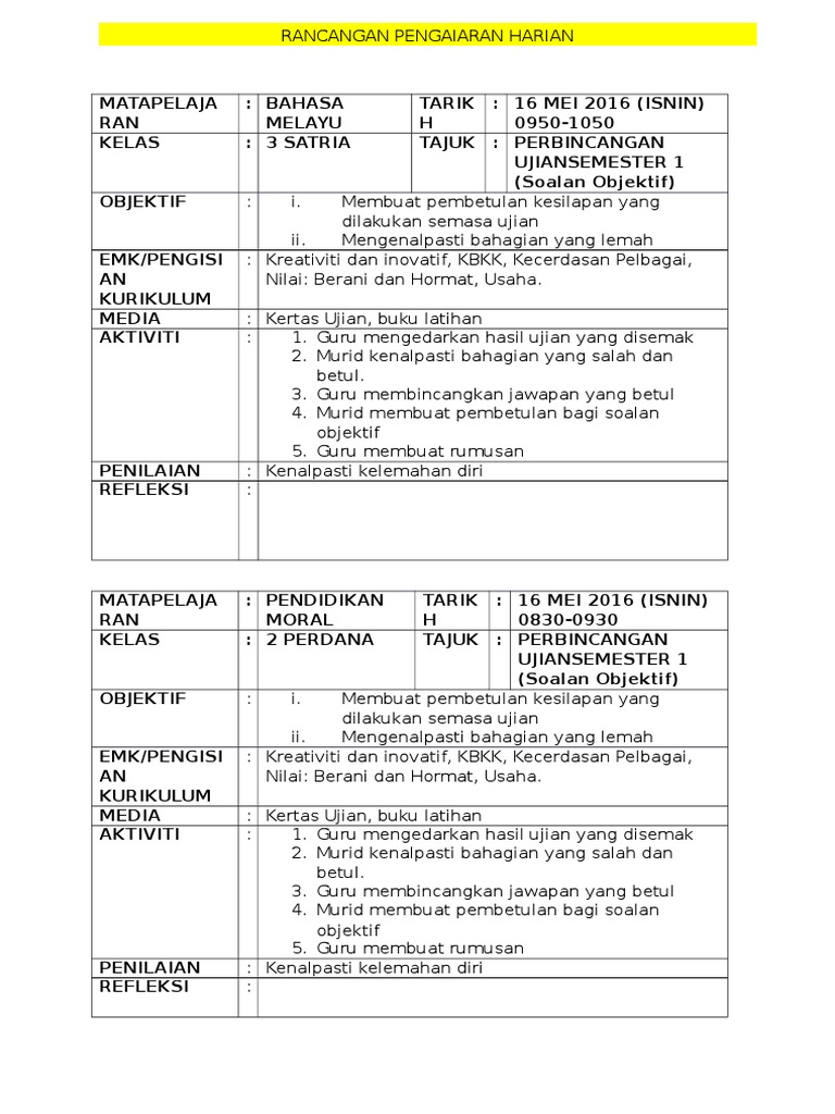 Rancangan Pengajaran Harian RPH Pelbagai Subjek 2021 Post written by Admin at. Pendidikan Seni Visual 1110 1225 pagi REFLEKSI CATATAN. RPH Minggu 44 07 Nov.